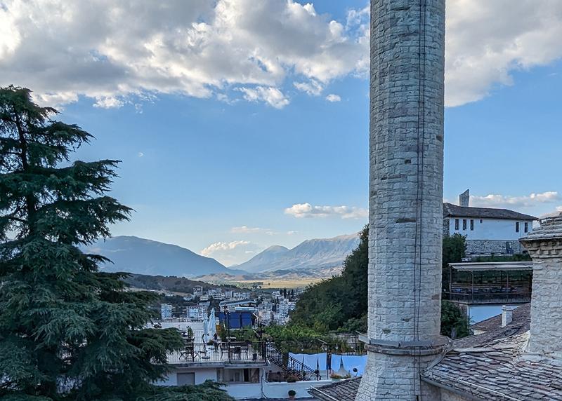 Leaving Alpeta winery and heading south, we stopped first at the site of Apollinia, an archaeological site on the way to Gjirokaster. It was great to be able to walk the site with few tourists and take our time. But travel days are hard, and kids have only so much attention, so we moved on. We got to Gjirokaster in the afternoon, and, after a scary drive up a cobbled street, we found our hotel conveniently located in the center of the city's bazaar. It was a great place, though perhaps a little noisy at night for a family with kids. Still, the location was perfect. Sara dumped the car, we unloaded, and we found dinner in a little place up the street from the bazaar with great views and a wide range of traditional Albanian food. We went back to the hotel and listened to the thumping bass of the downstairs Irish bar until 11:30pm.