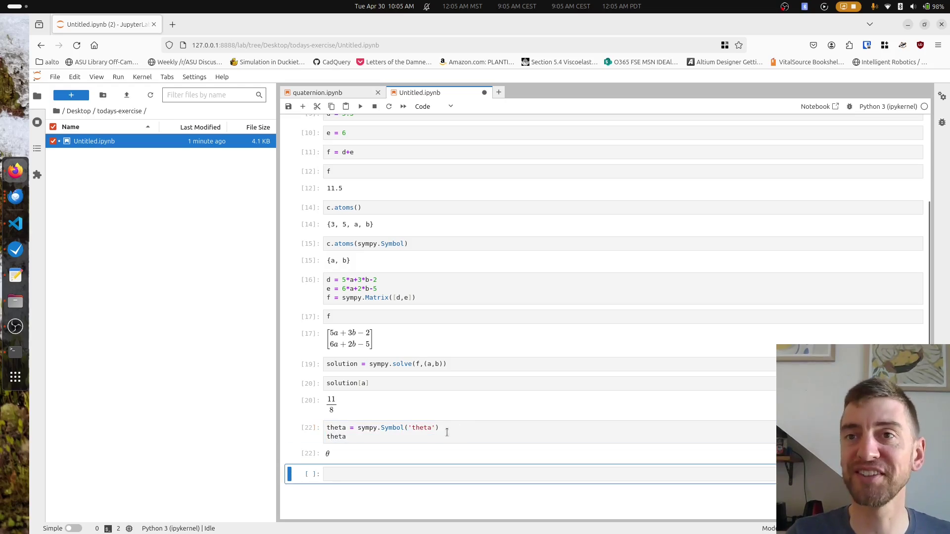 The sympy package in Python is useful for forming and working with symbolic expressions rather than literals. A "literal", in programming terms, is a numeric value, like 1.2. You can assign numeric, literal values to variables in Python natively, and use python expressions to find numeric answers to expressions. But what if you wanted to work with the expression or equation itself? This is where "symbolic" variables come in.