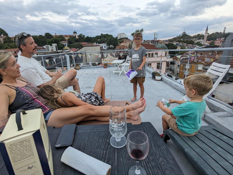 We hiked up three of Plovdiv’s seven hills and saw lots of sights. Laura, (little) Ben, and I hiked up to the top of the monument. We met up with the rest of the crowd, ate a quick lunch at the end of the children’s train line, and continued on to the children’s train. It didn’t run again for a couple hours, so we let the kids play in a playground while we got coffee and beer. We were all feeling tired and a bit out of it. The children’s train was stuffy and slow, and not worth the time or hike. We taxied home and ate dinner on the roof.