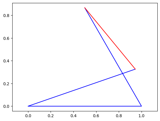 There are two solutions. Substituting in the first solution for the answer to our dependent variable (qc), we can plot it. Note that we plot the coupler in red as its position is inferred from our solution, but not explicitly solved for. If needed, this could be done in a later step