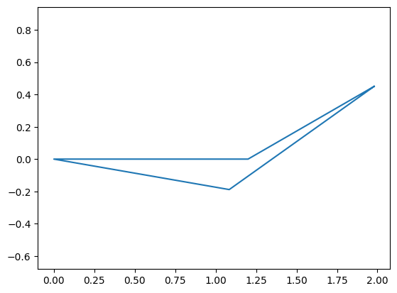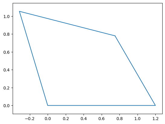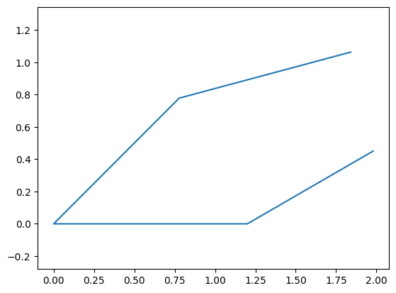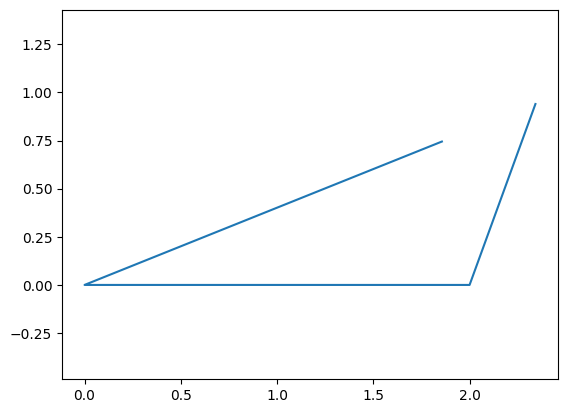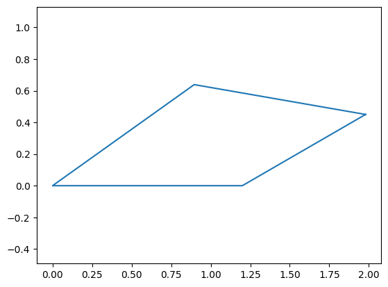 Assembling each point permits us to plot the mechanism. We create a variable called points, which holds a list of each point in a particular order convenient for plotting (between each of the points listed, we want to draw a line).
